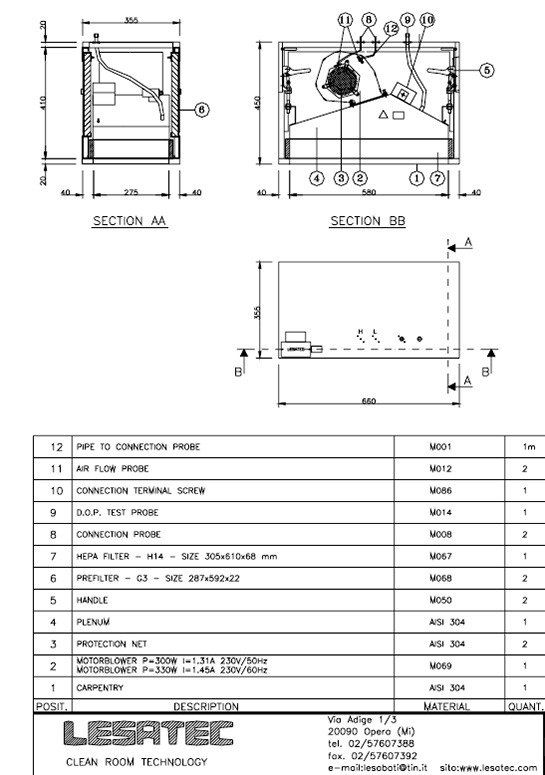- Classe di contaminazione del flusso d’aria: ISO 5 (0,5 um) secondo ISO 14644