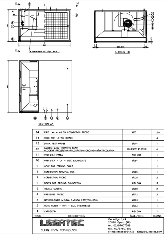 • Classe di contaminazione del flusso d’aria: ISO 5 (0,5 um) secondo ISO 14644