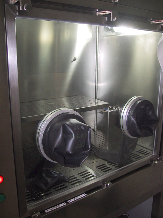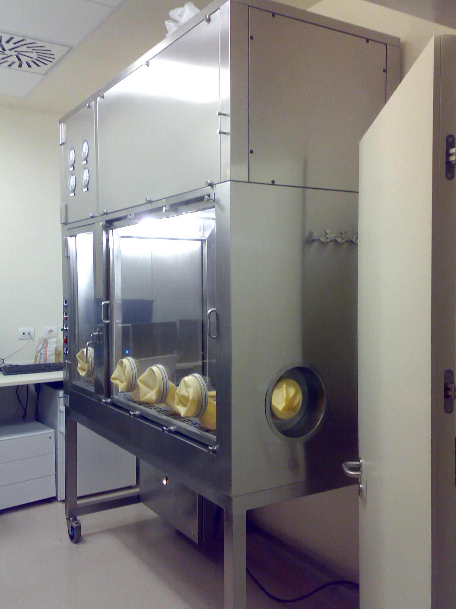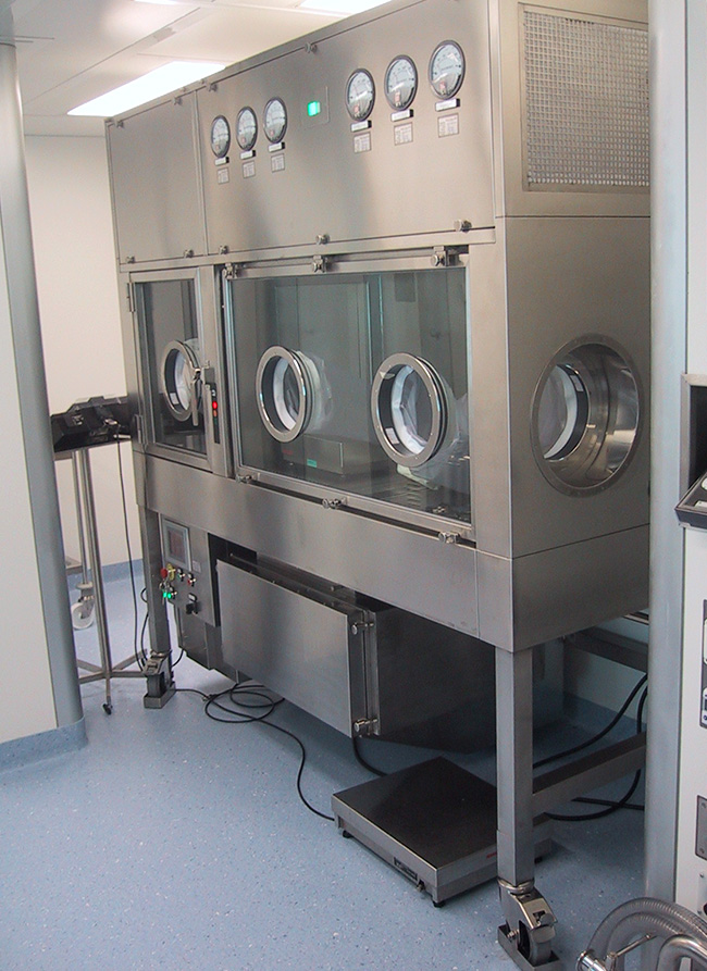 L'isolatore farmaceutico é un'apparecchiatura dedicata sia alla manipolazione di polveri tossico/nocive che di prodotti sterili, suddivisa in due vani separati, uno di lavoro ed uno per l’ingresso ed uscita del prodotto. Ogni vano è dotato di dispositivo di ventilazione a flusso unidirezionale verticale in classe ISO 5 (ISO 14644/1).